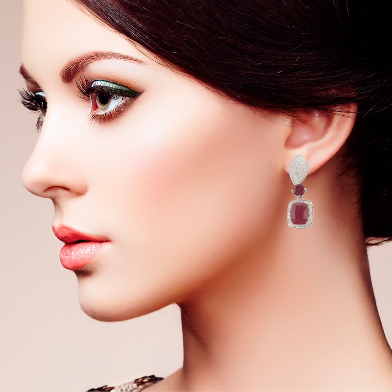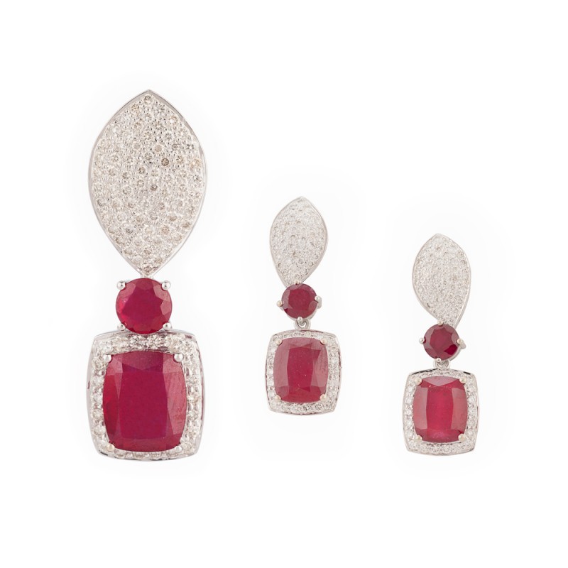 Made in 14 K Gold Gold (14 K) : 16.810 gms Diamond : 3.04 carat Ruby cushion (Glass Filled) : 18.70 carat Ruby round (Glass filled) : 4.00 carat Dimensions (inch) : Earring – 1.42 (L) ; 0.47 (W) / Pendant – 1.57 (L) ; 0.50 (W)