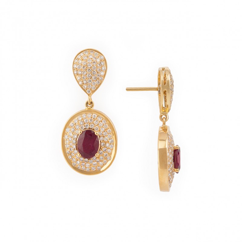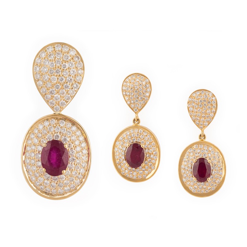 Made in 14 K Gold Gold (14 K) : 17.660 gms Diamond : 3.45 carat Ruby (Glass Filled) : 5.06 carat Dimensions (inch) : Earring – 1.57 (L) ; 0.80 (W) / Pendant – 1.58 (L) ; 0.82 (W)